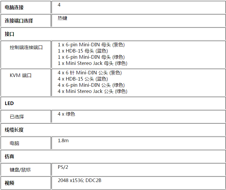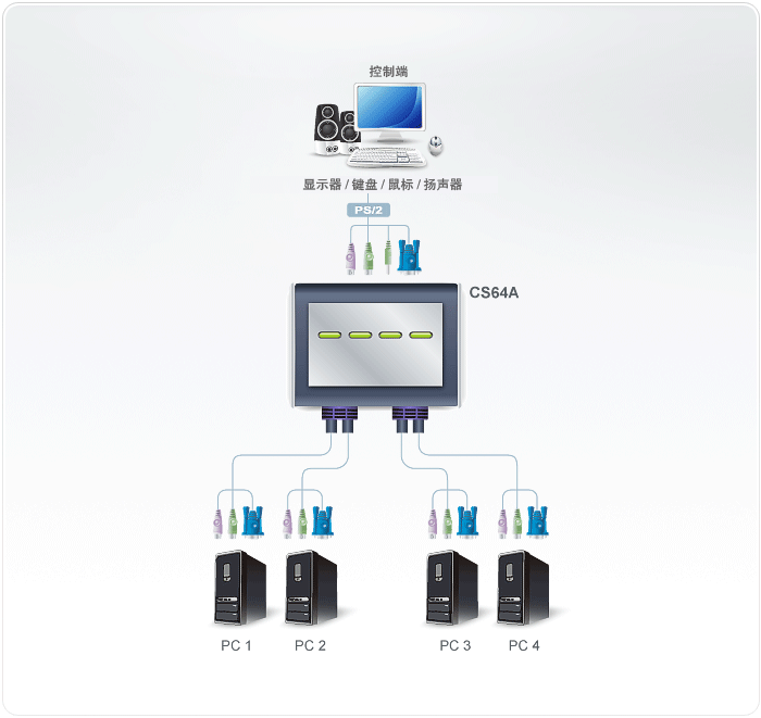 CS64A整合1.8m线缆并内建PS/2接口连接端口,设计十分轻巧,可从一组控制端控管4台服务器电脑主机。