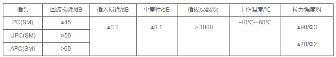 连接衰减:≦0.5dB(包括互换和重复) 互换回波损耗:≧35dB  插拔耐久性寿命:>1000次仍能满足衰减要求。