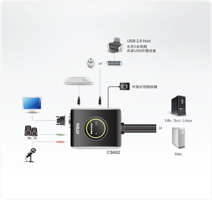 KVM/音频独立切换–用户在两台电脑之间进行切换时,可选择同步或异步切换扬声器及麦克风的音源,提升系统操作的方便性与弹性