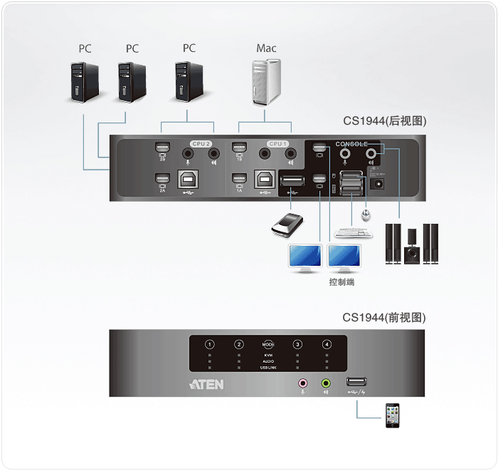 可从一组双屏幕USB接口控制端管理4台Mini DisplayPort电脑, 及两台USB外围设备