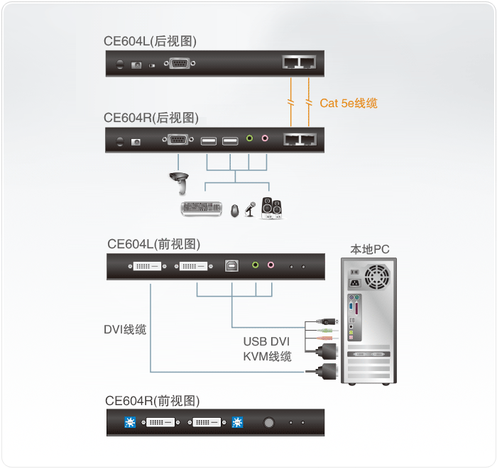 使用主要Cat 5e线缆可传输扬声器、键盘、鼠标、DDC以及一个DVI信号源;次要Cat 5e线缆传输RS-232、麦克风以及另一个DVI信号源