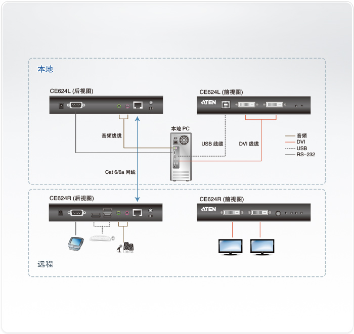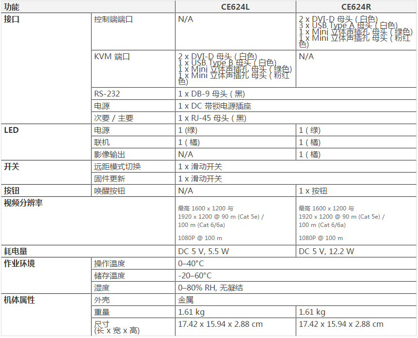 •通过单一Cat6/6a网线延伸视频、音频、USB及RS-232信号