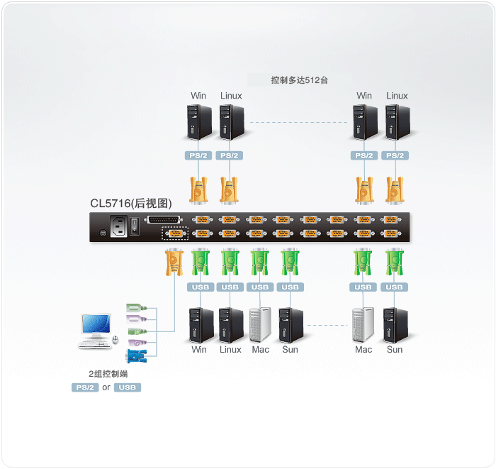 菊式串接另外31台设备 - 单一控制端可管理高达512台服务器(兼容的KVM多电脑切换器包括ACS1208A、ACS1216A、CS1708A、CS1716A)