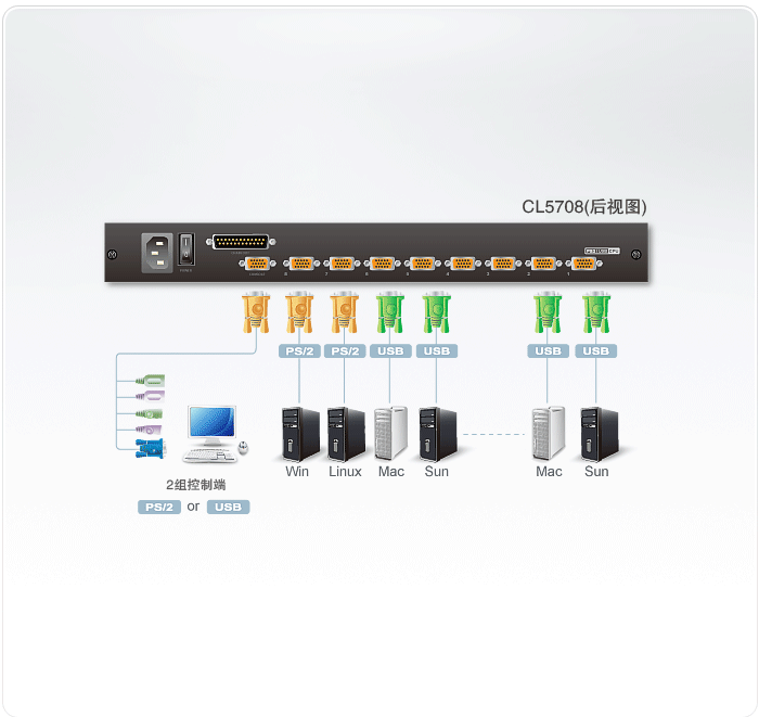 双接口–支持配备PS/2或USB键盘及鼠标的服务器与控制端