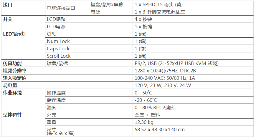 整合19" LED背光之LCD液晶显示器与KVM控制端于单一抽拉式机身内,仅占用1U机架空间,顶部和底部留有空隙以便顺畅操作