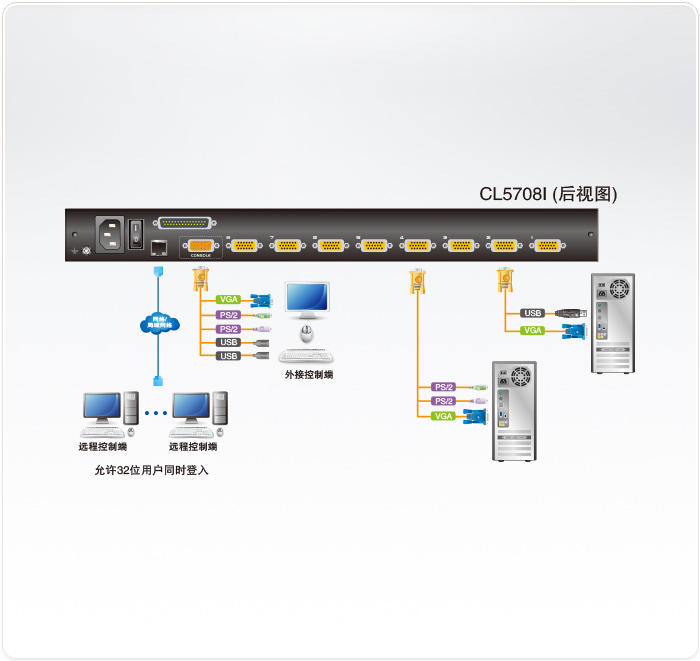 菊式串接另外15台设备- 单一控制端可管理高达128 台服务器(兼容的KVM多电脑切换器包括ACS1208A、ACS1216A、CS1708A、CS1716A)