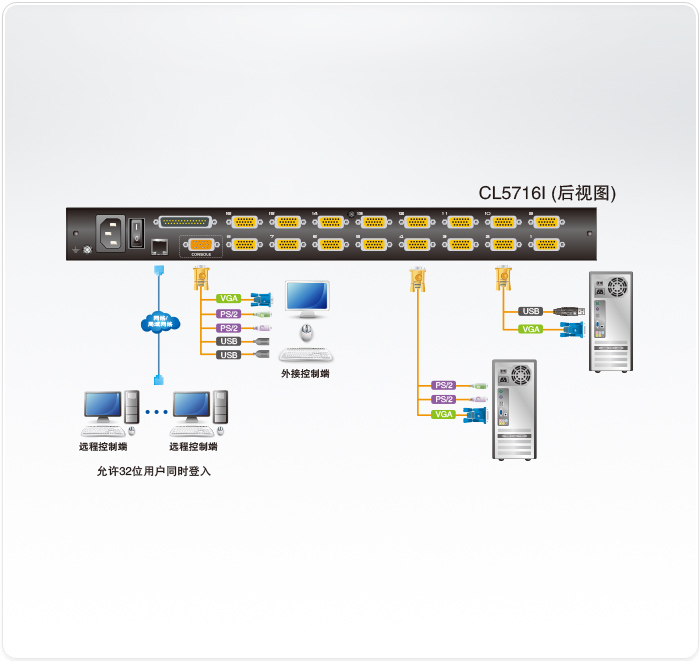 节省空间- 两组控制端(单一通道)可管理16台服务器