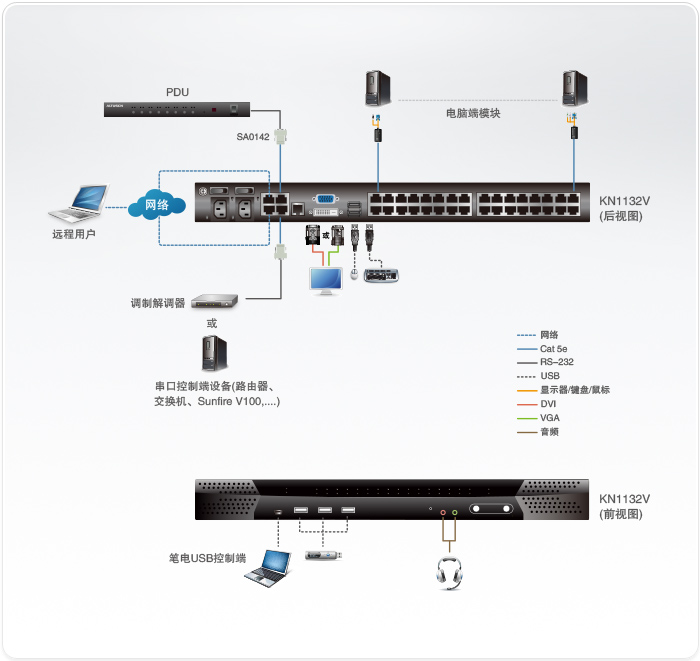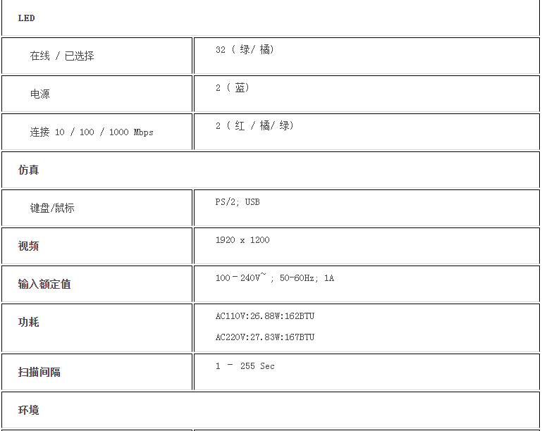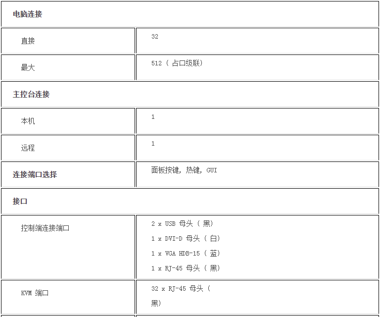 支持PS/2、USB、Sun Legacy(13W3) 及串口(RS-232) 连接