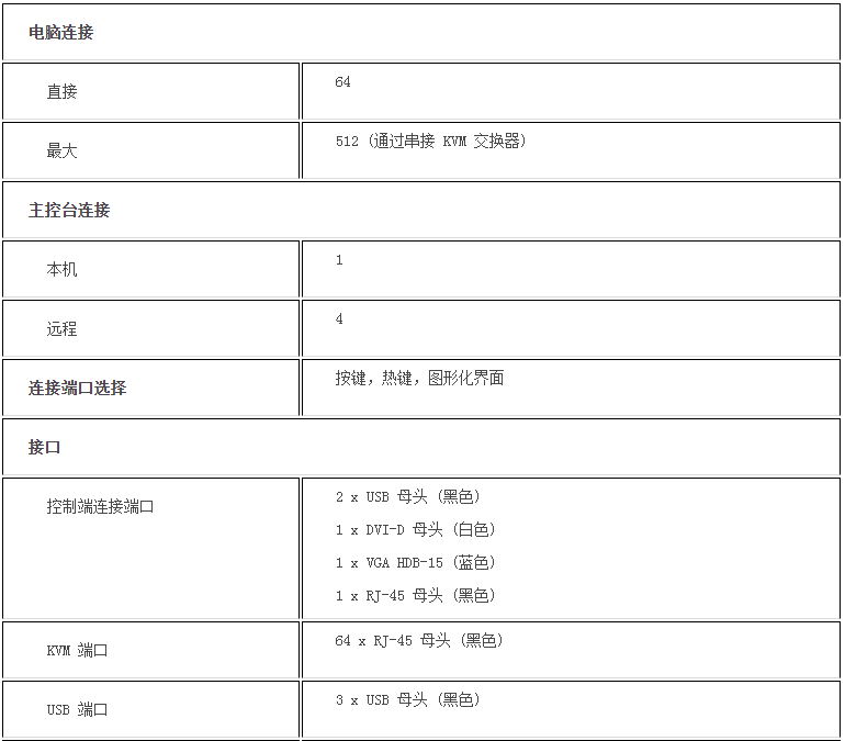支持PS/2、USB、Sun Legacy(13W3)及串口(RS-232)连接