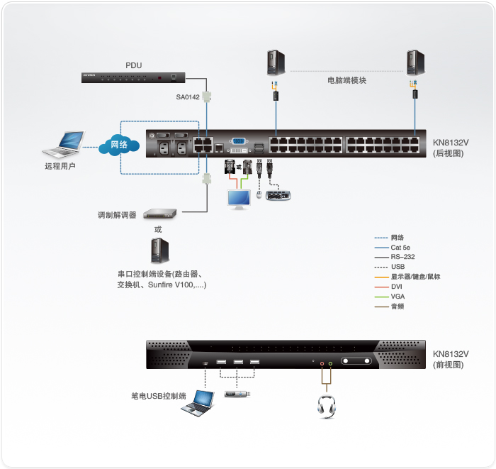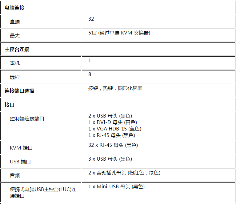 支持PS/2、USB、Sun Legacy(13W3)及串口(RS-232)连接