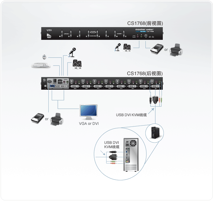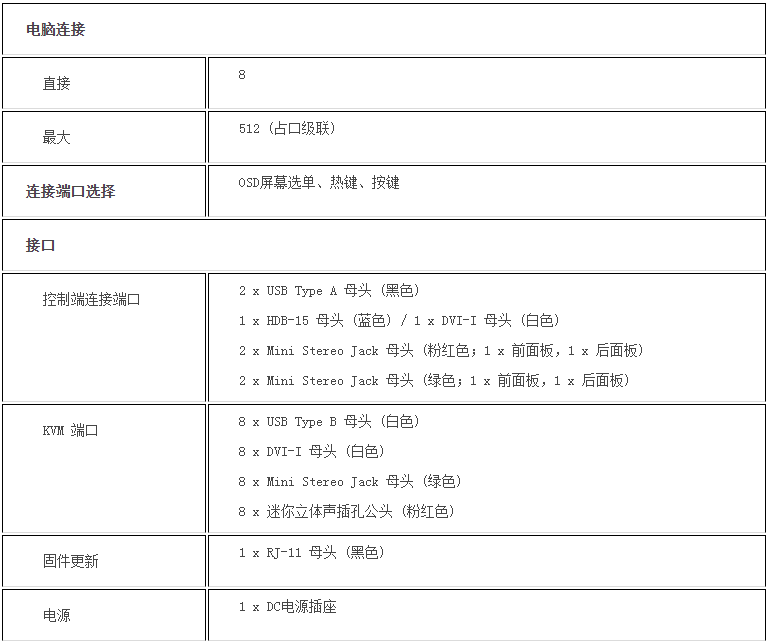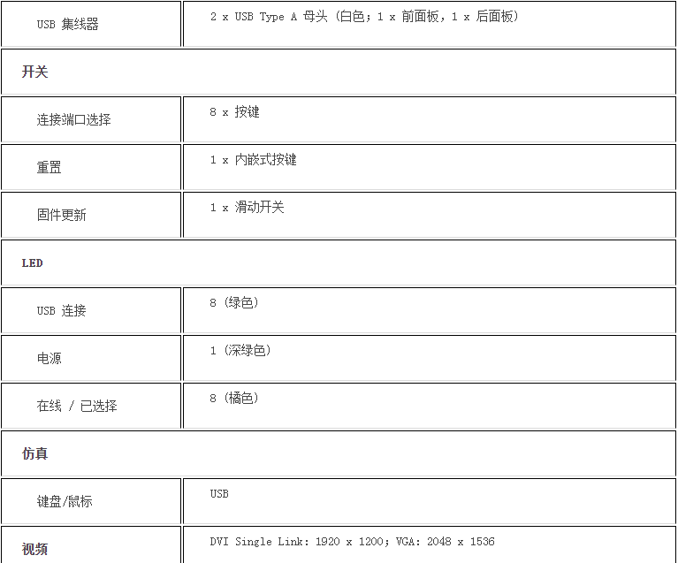 一组USB控制端可管理8台Single Link DVI或VGA电脑,及2台USB 2.0接口设备
