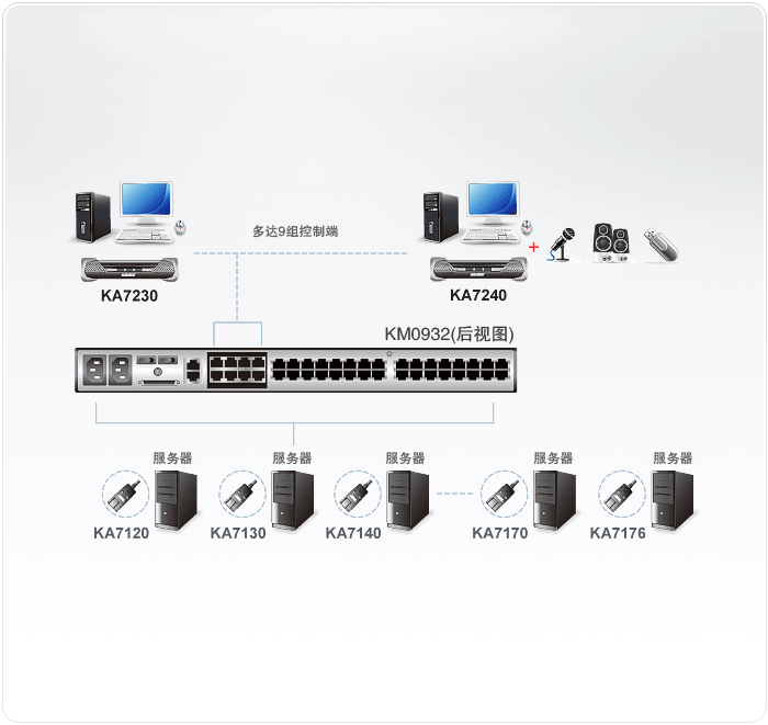 此控制端模块可控管一台本地电脑与矩阵式KVM多电脑切换器(KM0932/KM0532)