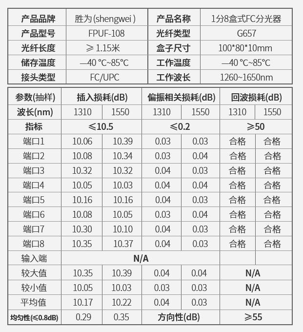 FPUF-108 电信 单模圆头FC/UPC盒式/拉锥式PLC分光器 1分8